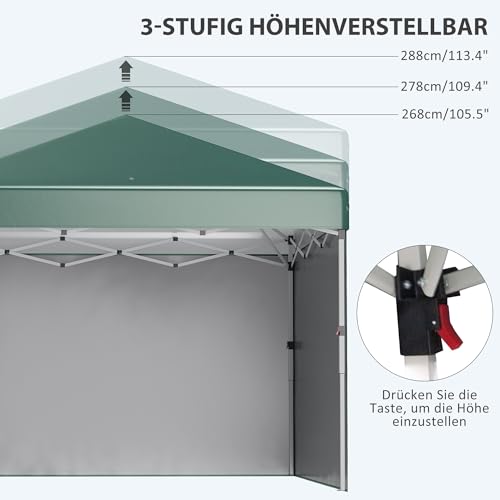 Höhenverstellbar: Passen Sie die Höhe Ihres Faltpavillons ganz einfach per Knopfdruck an den jeweiligen Anlass an. Sie haben die Auswahl zwischen drei Höheneinstellungen: 288, 278 und 268 cm