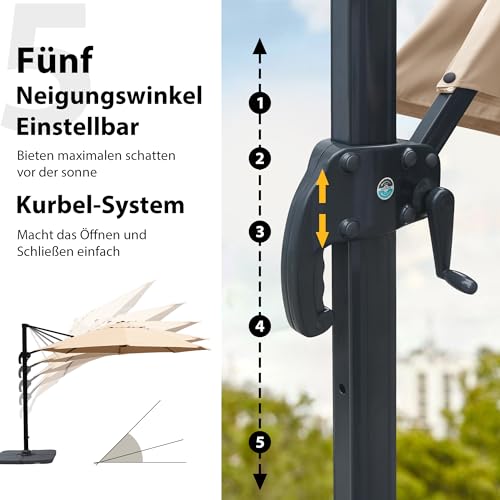 Die Bedienung des Marktschirms erfolgt via Kurbel. Am Schirmmast befindet sich ein Schiebegriff, Per dem Sie je nach Sonnenstand 5 verschiedene Neigungspositionen adjustieren können