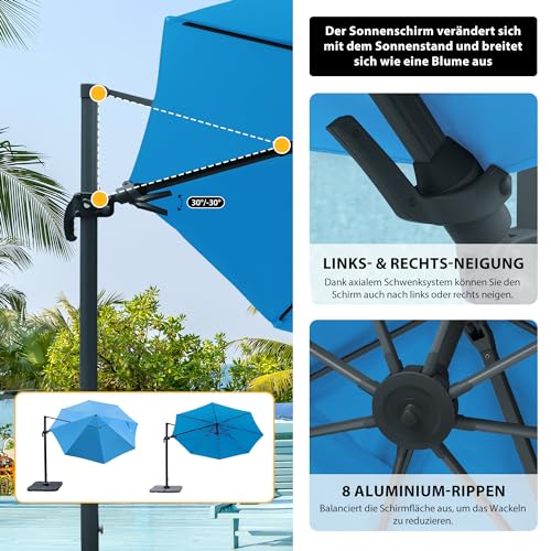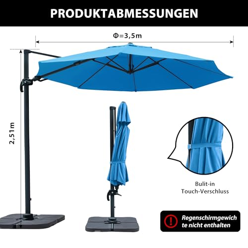 Mast und Gestell unseres Seitenarmschirms bestehen die Gesamtheit pulverbeschichtetem Alu, mit der Ablieferung erhalten Sie ein Standkreuz die Gesamtheit Stahl, für das Sie noch 4 Betonplatten benötigen