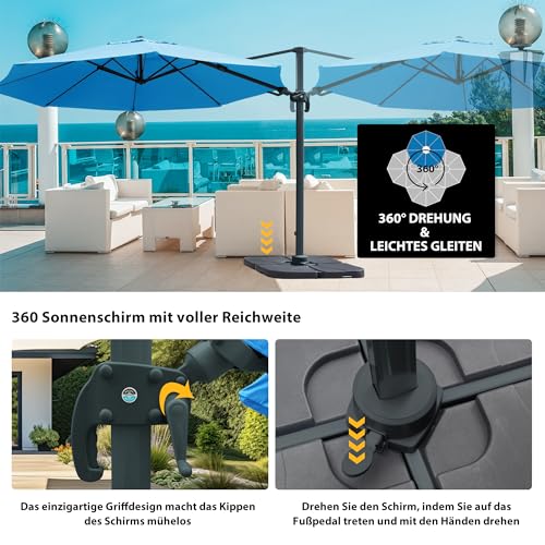 Mit dem am Schirmständer angebrachten Pedal lässt sich der große Hängesonnenschirm (Ø 3,5 m) um 360° schwenken