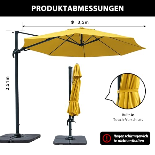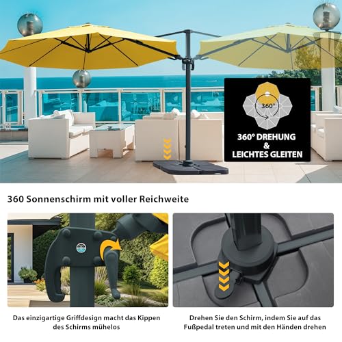 Mit dem am Schirmständer angebrachten Pedal lässt sich der große Hängesonnenschirm (Ø 3,5 m) um 360° schwenken