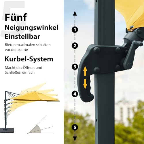 Die Bedienung des Marktschirms erfolgt mittels abnehmbarer Kurbel. Am Schirmmast befindet sich ein Schiebegriff, mit dem Sie je nach Sonnenstand 5 verschiedene Neigungspositionen anpassen können. Alias eine axiale Verlangen nach modern oder rechts ist vielleicht, um die optimale Beschattung zu erzielen