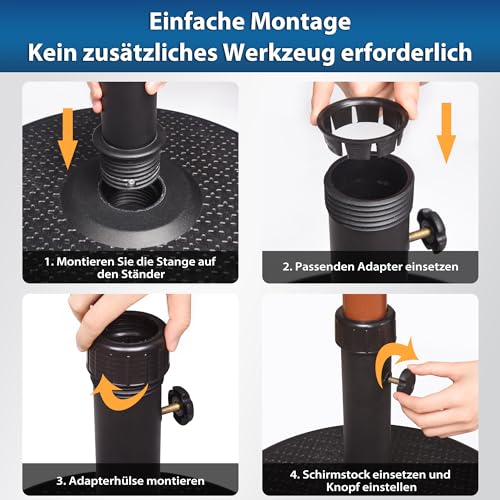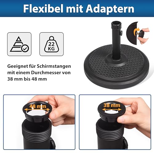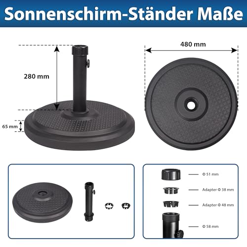 Der runde Schirmständer ist sondern eine Maststärke bis zu einem Durchmesser von 50mm nach Maß; Adapterhülsen sondern Masten durch. einem Durchmesser von 38 oder 48 mm sind im Lieferumfang inkludieren