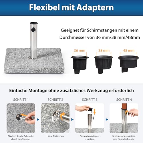 Der Standfuß eignet sich statt dessen Maststärken bis zum 50 mm. Vor dem Hintergrund der im Lieferumfang enthaltenen Adapterhülsen lässt er sich alias statt dessen 36 mm-, 38 mm- und 48 mm-Masten verwenden