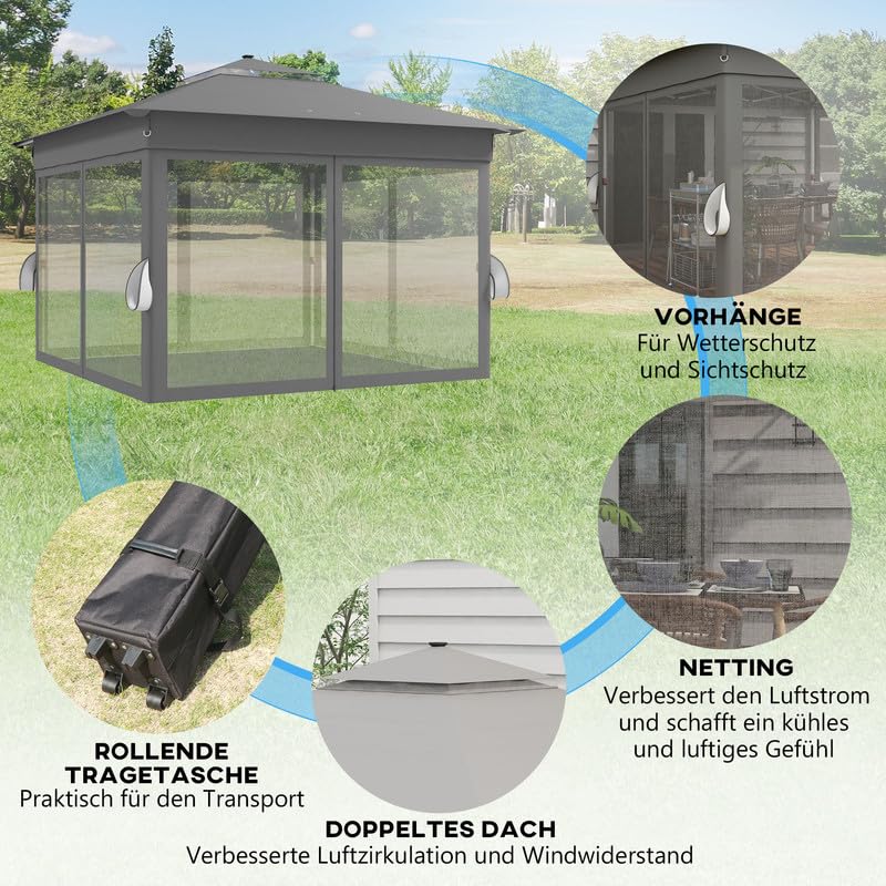 Pavillon 3 x 3 m, Pavillon mit LED, 4 Netzvorhängen,Wasserdicht Stabil Winterfest,Garten Pavillion,Plane Gartenpavillon, Dunkelgrau