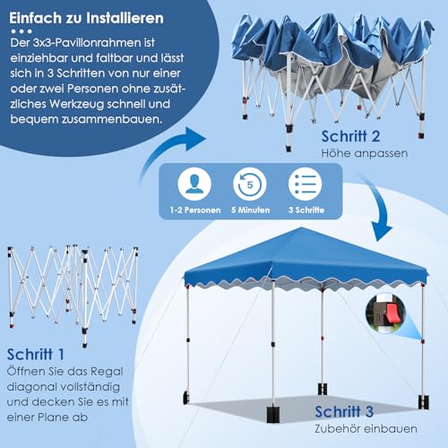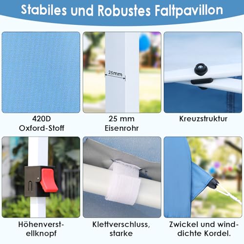 Pavillon 3×3 Faltpavillon, Wasserdicht Partyzelt 420D Oxford, UV-Schutz 50+ Gartenpavillon, Gartenzelt inkl. Sandsack Geschliffene Nägel Aufbewahrungstasche, Pavillons für Garten Party Hochzeit, Blau