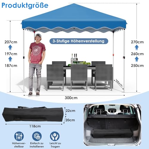 ❤️【HÖHENVERSTELLBAR】: Durch den roten Knopf an der Stützstange kann der 3×3-Pavillon eine dreistufige Höhenverstellung von 250–260–270 cm erreichen. Der 3×3-Pavillon misst 300 x 300 x 270 cm, bietet 9 Quadratmeter schattigen Universum und bietet Platz für 6–10 Personen gleichzeitig, was ihn ideal für kleine Zusammenkünfte im Freien macht.