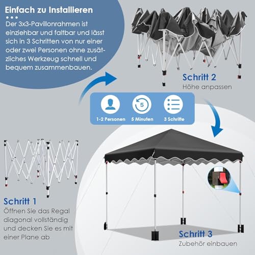 Pavillon 3×3 Faltpavillon, Wasserdicht Partyzelt 420D Oxford, UV-Abschirmung 50+ Gartenpavillon, Gartenzelt inkl. Sandsack Geschliffene Nägel Aufbewahrungstasche, Pavillons für Garten Party Hochzeit