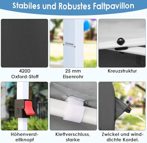 ❤️【ROBUST UND STABIL】: Der 3×3-Pavillon verwendet verdicktes, versilbertes 420D-Oxford-Gewebe als Oberbezug, das haltbarer als Polyestergewebe ist. Die Beinrohre bestehen aus Metall und messen 25 x 25 x 0,6 mm. Das Kreuzrahmen-Strukturdesign ist sicherer und stabil. Darüber hinaus sorgen die übergroße Bodenplatte, Klettverschlüsse, Erdnägel, winddichte Seile und Sandsäcke zusätzlich für die Stabilität des 3×3-faltpavillon.