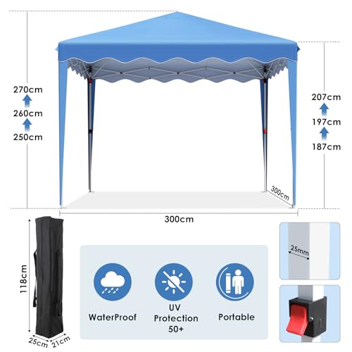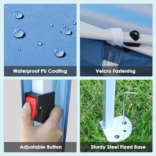 ⛱️【Höhenverstellung Design】Faltpavillon 3×3 wasserdicht hart im Nehmen Jedes Bein verfügt über Auf-und Ab Schnellverschlussknöpfe,sich sehr einfach zusammenklappen und in der Höhe verstellen lassen ( 250cm, 260cm und 270cm).Hinweis: Bitte seien Sie beim Einstellung der Höhe kritisch,Einklemmen Ihrer Finger Umgehen. extremen Wetterbedingungen (wie Starker Wind,starker Regen,Schneesturm ) ,wird empfohlen,Partyzelt zusammenzufalten und Innenbereich aufzubewahren,Umgehen starken Schneefall oder starke Winde,die den Rahmen wegblasen oder zerdrücken.