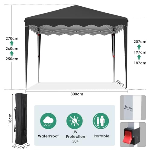 ⛱️【Robuste und Langlebige】Der Pavillon 3×3 neu aufgerüstete Stahlrahmen ist mit Pulverbeschichtung versehen,um Stabilität und Korrosionsbeständigkeit zu Verarbeiten,rostet,verbiegt oder bricht es nicht.Robuste Gelenkverbinder und 4 verriegelbare Stahlbeine bieten eine gute Unterstützung für den wasserdichten Pavillon. In der Fußplatte befinden sich 3 Löcher.Nägel und Spannschnüre abschwächen die Befestigung des Pavillons und machen ihn windbeständiger.