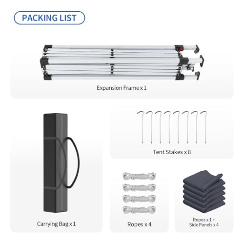 【Einfache Montage mit tragbarem Design】Dieses Outdoor Pavillon ist sehr einfach aufzubauen. Öffnen Sie einfach das Faltpavillon,drücken Sie die Querstreben zusammen, um den Aufbau zu lindern, und decken Sie es mit dem Zeltoberteil ab. Stellen Sie die gewünschte Höhe ein und abhalten Sie den Rahmen. Es sind keine Werkzeuge erforderlich, und der Aufbau dauert Im Kontrast dazu wenige Minuten. Das faltbare Design ist einfach zu verstauen und eignet sich hervorragend für temporäre Aktivitäten.