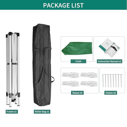 【Lieferumfang】1 x 3 x 3 meter großer Pop-Up-Pavillon für den Außenbereich und passendes Zubehör wie 1 x Tragetasche, 4 x Seile und 8 x Heringe. Dies bietet Ihnen eine nahtlose Installation, ohne dass Sie etwas anderes benötigen. Die 420D-Oxford-Tragetasche wird mit Rädern geliefert, um den Transport zu mildern.