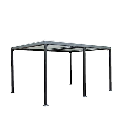 Mit unserem Lamellenpavillon Lamilion erhalten Sie einen robusten und wetterbeständigen Ort, der Ihnen zu jeder Jahreszeit einen komfortablen Aufenthalt im Freien ermöglicht und aufgrund seines verstellbaren Aluminiumdachs zuverlässigen Schutz vor Sonne, Regen und Insekten bietet. Das Gestell besteht aus pulverbeschichtetem Aluminium, was für hohe Standfestigkeit und Witterungsbeständigkeit sorgt. Die hochwertigen Aluminium-Lamellen passen perfekt zur Überdachung und sorgen für angenehmen Schatten und mediterranen Flair in Ihrem Garten.