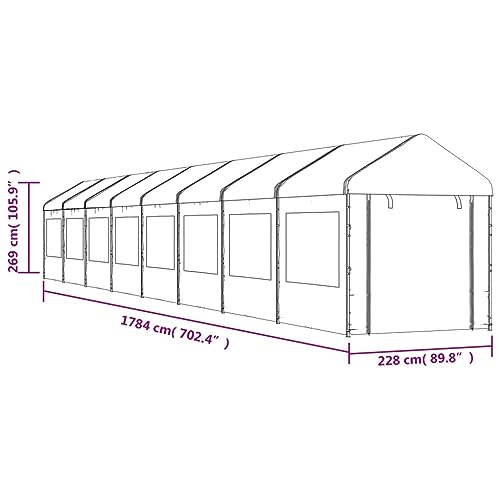 Pavillon mit Dach weiß 17,84 x 2,28 x 2,69 m Polyethylen Dieser Pavillon mit Dach und Seitenwänden ist ein idealer Schutz vor der Sonne. 【Langlebiges Material】Polyethylen (PE) ist das am häufigsten verwendete Kunststoffmaterial. Seine Verwendung in Möbeln bietet Funktionalität, da es UV-beständig, leicht und auch pflegeleicht ist. Stabile Konstruktion: Der Stahlrahmen dieses Pavillons sorgt für Stabilität und Stabilität. Großartiger Schutz: Das Festzelt mit 1 Dach und 18 Seitenwänden bietet hervorragenden Schutz vor Sonne, Regen und Wind, was es zu einer großartigen Option für Veranstaltungen im Freien macht. Praktisches Design: Das Eventzelt ist mit 2 Reißverschluss-Seitenwänden für den Eingang und einfachen Zugang ausgestattet. Außerdem ist das Zelt einfach auf- und abzubauen.Breite Anwendungen:Dieses Schutzzelt kann für eine Vielzahl von Zwecken verwendet werden, vom Essen im Freien und Unterhaltung bis hin zu Entspannung und Meditation. Gut zu wissen: Dieses Produkt ist nicht geeignet für den Einsatz bei schlechten Wetterbedingungen wie starkem Wind, starkem Regen, Schnee, Sturm usw. Rasen und Garten, Outdoor-Wohnen, Außenstrukturen, Vordächern und Pavillons