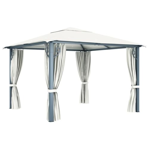 Pavillon mit Vorhang und LED-Lichterkette, 3 x 3 m, cremefarbenes Aluminium. Dieser Pavillon mit Vorhängen verfügt über ein klassisches und elegantes Design, das den perfekten Sonnenschutz für Veranstaltungen im Freien wie Abendessen, Grillabende, Familienfeiern und andere Aktivitäten bietet. Das Dach aus Oxford-Gewebe mit PA-Lackierung schützt Sie vor Blendung und schädlichen UV-Strahlen der direkten Sonneneinstrahlung. Der Pavillon ist solide konstruiert aus starkem Aluminium und Stahl, dadurch rostbeständig und sehr stabil. Der Pavillon wird mit 4 Seitenwänden geliefert, die bei schlechtem Wetter gezeichnet werden können. Netzgitter sind ebenfalls enthalten, um Insekten fernzuhalten und gleichzeitig eine gute Luftzirkulation zu gewährleisten. Zur einfachen Befestigung sind auch Klettverschlüsse enthalten. Zusätzlich schafft die Lichterkette bei Sonnenuntergang eine gemütliche Atmosphäre in Ihrem Garten. Die Lichter bringen keine Umweltverschmutzungen, da sie tagsüber durch Sonnenenergie aufgeladen werden. Der Pavillon kann mit dem mitgelieferten Befestigungszubehör einfach am Boden befestigt werden. Hinweis: Dieses Produkt sollte niemals bei schlechtem Wetter wie starkem Wind, starkem Regen, Schnee, Sturm usw. verwendet werden. Rasen und Garten, Outdoor-Wohnen, Außenstrukturen, Vordächer und Pavillons