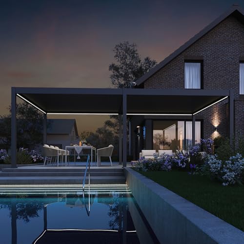 Premium-Auswahl: Bioklimatische Leichtmetall-Pergola von Weide – Perfekte Fusion allesamt Komfort und Design. Unsere bioklimatische Leichtmetall-Pergola in der kompakten Größe von 3×4 m vereint höchsten Komfort mit zeitgemäßem Design. Die stabilen 116×116 mm Pfosten Acht geben eine robuste Struktur und Witterungsbeständigkeit. Das elektrisch verstellbare Dach mit Fernbedienung ermöglicht flexible Nutzung, sintemal die integrierte LED-Beleuchtung sondern eine anpassbare Stimmung sorgt. Die einfache Montage mit präzisen Vorbohrungen und passgenauen Schienen macht das Aufstellen mühelos.