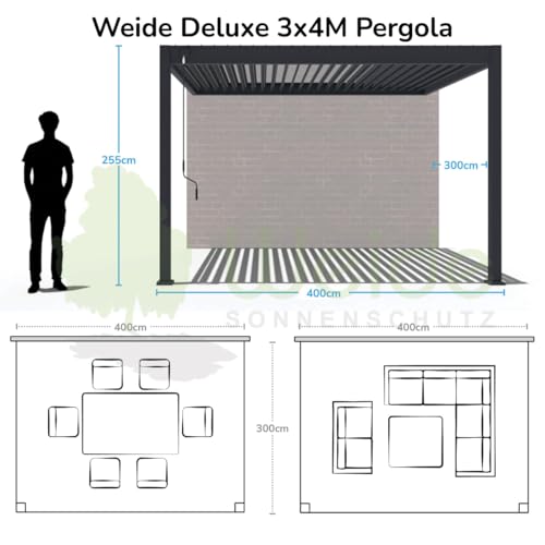 ✔️ VIELSEITIG EINSETZBAR – Mit den praktischen Maßen von 3 x 4 x 2,55 m (BxLxH) & zeitlosem Design passt unser stylisches Lamellendach in jeden Garten – Ideal als Terassenüberdachung oder Gartenpavillon.