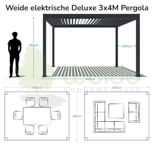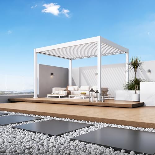 Pavillon Pergola 3x4m Terassenüberdachung freistehend mit Lamellendach verstellbar Gartenpavillon mit LED Hardtop wasserdicht stabil Winterfest Voll-Aluminium Weide Deluxe mit Fernbedienung Weiß