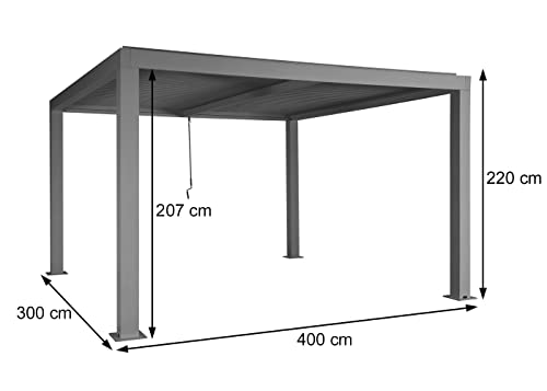 Dimensionen (HxLxB): 220x300x400cm | Material: Gestell und Dach: Pulverbeschichtetes Aluminium – Kurbel: Stahl (95%) + Kunststoff (5%) – Schrauben: Stahl | Farbe: Gestell und Dach: anthrazit