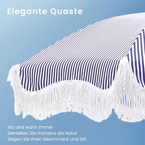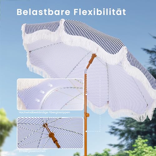 PHI VILLA Sonnenschirm Balkon Sonnenschutz 200 cm Knickbar Rund mit Fransen, Boho Strandschirm Garten Windbeständig Sonnenschirme Balkonschirm mit Erdspieß für Terrasse, UPF 50+, Blaue mit Streifen