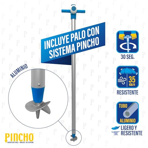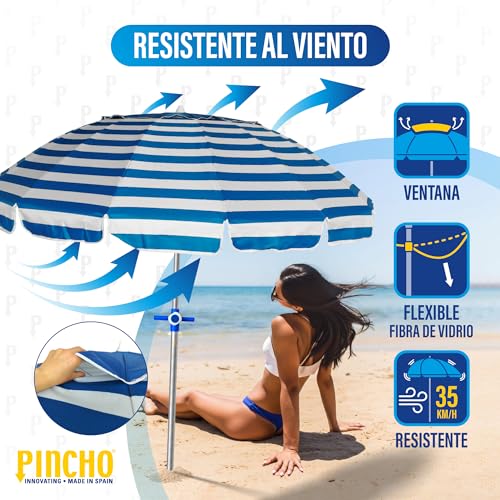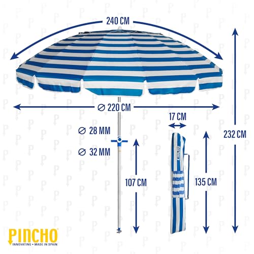 Pincho Sonnenschirm 240 cm, 16 Fiberglasstäbe, Polyestergewebe mit Sonnenschutz UPF50+ (blockiert 99 % der UV-Strahlen), Sonnenschirm für Strand / Garten aus Aluminium mit 2,4 m Durchmesser.,