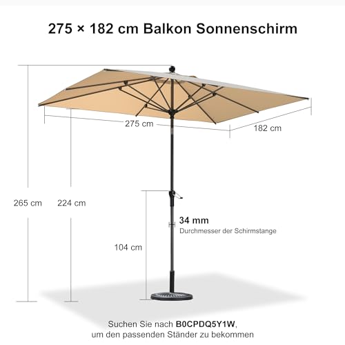 PURPLE LEAF Aluminium Sonnenschirm 270 x 180 cm, Balkonschirm mit Kurbel und neigbar, rechteckig Gartenschirm Marktschirm, Sonnenschutz, für Schwimmbäder, Terrasse, Beige