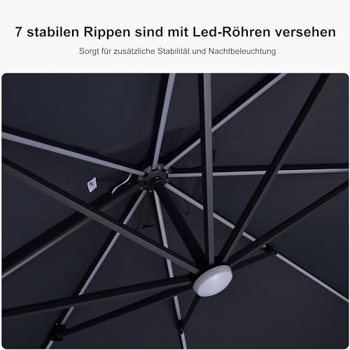 Stabilität und Beleuchtung – Alurahmen pulverbeschichtet, 8 stabile Rippen sehen nach Abseitsposition Stabilität. Jede der 7 Rippen der Ampelschirm verfügt über LED-Lichtröhre, die nachts für ausreichende Beleuchtung bei Nacht