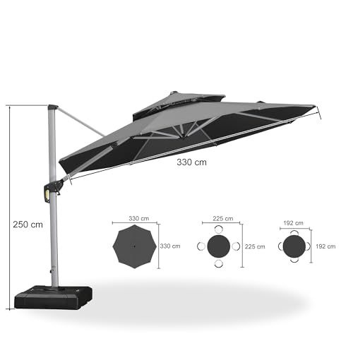 Großer Schattenbereich: Ampelschirm (mit Sonnenschirmständer) 330 cm, das Ihnen eine größere Sonnenschutzfläche bietet,Sonnenschirm mit Doppeldach, verhindert Umkippen bei Wind und gewährleistet Haltbarkeit