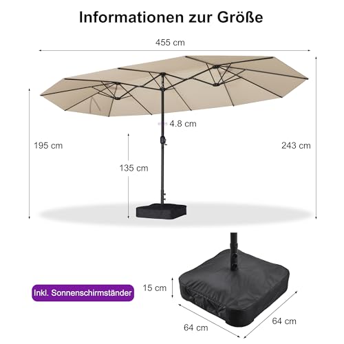 Großer Schattenbereich: Dieser 455 cm große Terrassenschirm mit doppelt großem Design bietet Ihrer Familie und Freunden einen besonders großen Schattenbereich. Unter dem Sonnenschirm können Sie eine Reihe von Gartenmöbeln platzieren