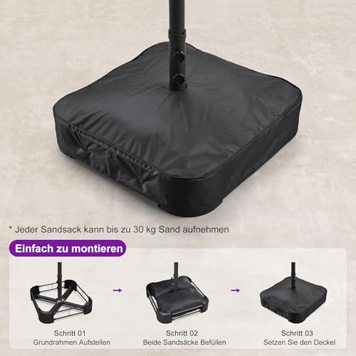 Abmessungen: Maße – ca. 455 x 270 cm, Schirmhöhe – ca. 243 cm, Durchmesser der Stange – ca. 48 mm. Das Set enthält einen Sonnenschirm, einen Ständer und Sandsäcke (Sand nicht im Lieferumfang enthalten)
