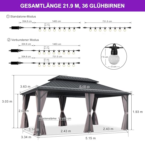 PURPLE LEAF Gartenpavillon 3.65 x 5.45 m Wasserdicht Stabil Winterfest, Basisch Alu Pavillon mit Festem Dach Hardtop Pavillon mit 21.9 m 36 LED Lichterkette Glühbirnen für Partyzelt, Grau