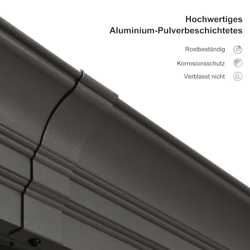 Aluminiumrahmen: Pulverbeschichtet, hat eine dekorative Textur und ist lückenlos in die Beschichtung integriert, splittert oder blättert nicht ab und ist besonders langlebig. Der Rahmen stützt die gesamte Struktur fest und hält Windgeschwindigkeiten von bis zu 40 MPH stand