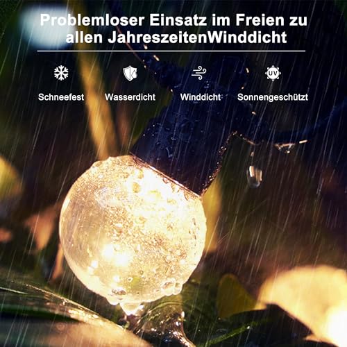LED-Lichterketten: Ausgestattet mit bruchsicheren PET-Glühbirnen halten sie heißem, regnerischem Wetter stand und sind wasserdicht nach IP44. Sie verfügen über eine CE-Zertifizierung, eine sichere Ausgangsspannung von 24 V, strahlen warmweißes Licht mit einer Helligkeit von 2700 K ab und haben eine Lebensdauer im Freien von bis zu 10.000 Stunden.