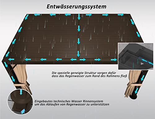 Aluminiumrahmen: Bestehend aus einem rostbeständigen pulverbeschichteten Aluminium Rahmen ist er korrosionsbeständig und für den dauerhaften Außeneinsatz geeignet. Die Pfosten sind mit vorgebohrten Löchern versehen, um sicherzustellen, dass der Pavillon stabil und robust ist.