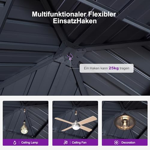 Multi-Szenen-Einsatz: Gesamtmaße: 400L x 400B x 316H cm, Spaltengröße: 12 x 12 cm. Der Pavillon kann zum Platzieren von doppelsofa, sitzgarnitur 6+1 sowie Massagewannen genutzt werden, es kann bekannt als zum Löschen von Fahrrädern, zum Sperren von Grillparty und für andere Aktivitäten verwendet werden