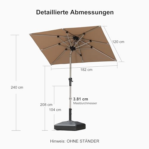 PURPLE LEAF Sonnenschirm 120 x 180 cm Rechteckig Aluminium Gartenschirm mit Kurbel zum Öffnen Schließen Kinckbar Marktschirm UV-beständig Tischschirm Wasserdichter Mittelstockschirme für Gärten, Taupe