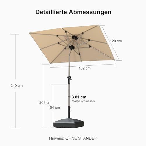 PURPLE LEAF Sonnenschirm 120 x 180 cm Rechteckig Aluminium Gartenschirm mit Kurbel zum Öffnen Schließen Kinckbar Marktschirm UV-beständig Tischschirm Wasserdichter Mittelstockschirme für Gärten, Beige