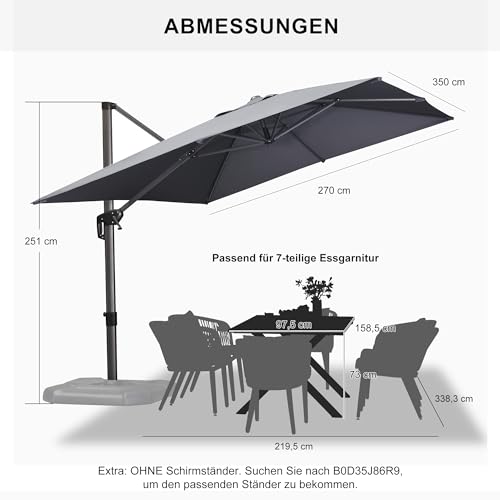 Abmessungen – Die Größe dieses Sonnenschirms beträgt ca. 270 x 350 cm (Fehler ca. 2 cm). In Kombination mit der großen Tuchfläche von ca. 270 x 350 cm haben Sie so immer einen schattigen Platz zur Verfügung