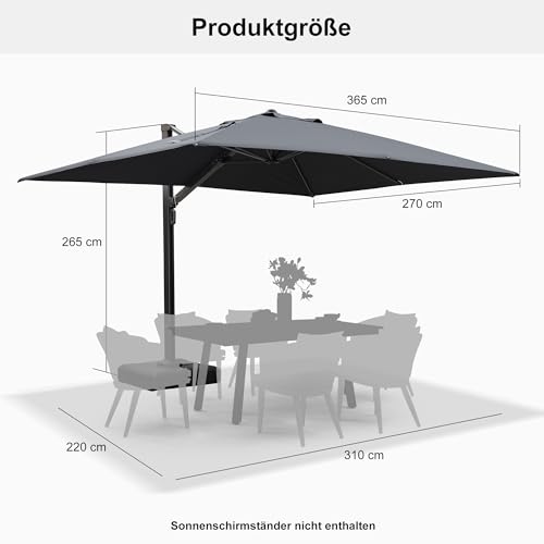 PURPLE LEAF Sonnenschirm 270 x 365 cm mit Kurbel Ampelschirm Groß Drehbar 360°Rotation, Gartenschirm Gestell Aluminium, Marktschirm XXL Sonnenschutz UV50+, Grau