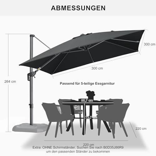 Abmessungen: Die Größe dieses Sonnenschirm beträgt ca. 300 x 300 cm(Fehler ca. 2 cm). In Kombination mit der großen Tuchfläche von ca. 300 x 300 cm haben Sie so immer einen schattigen Platz zur Verfügung