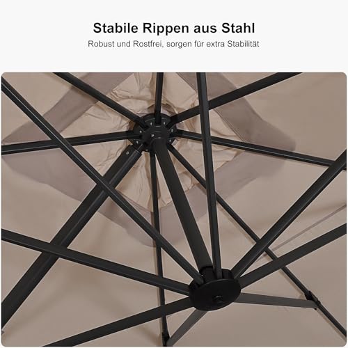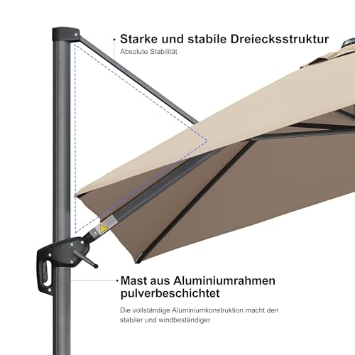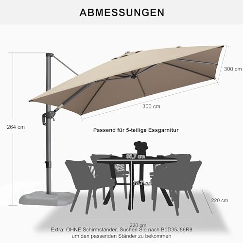 Abmessungen: Die Größe dieses Sonnenschirm beträgt ca. 300 x 300 cm(Fehler ca. 2 cm). In Kombination mit der großen Tuchfläche von ca. 300 x 300 cm haben Sie so immer einen schattigen Platz zur Verfügung