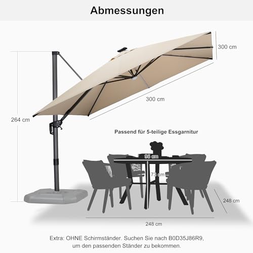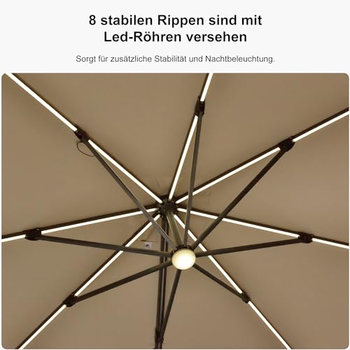 Solar-LED-Leuchten: Der PURPLE LEAF Gartenschirms verfügt über LED-Lichtröhre und ein vorinstalliertes Mittellicht, die nachts für angemessene Beleuchtung. Das Solarmodul am Schirmtop liefert ausreichend Strom, ergo das Licht ca. 5–6 Stunden