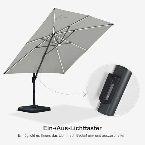 Solar-LED-Leuchten – Der PURPLE LEAF Gartenschirms verfügt über LED-Lichtröhre und ein vorinstalliertes Mittellicht, die nachts für angemessene Beleuchtung. Das Solarmodul am Schirmtop liefert ausreichend Strom, damit das Licht ca. 5–6 Stunden