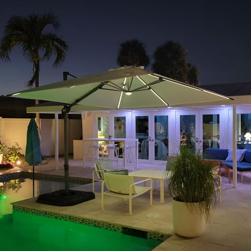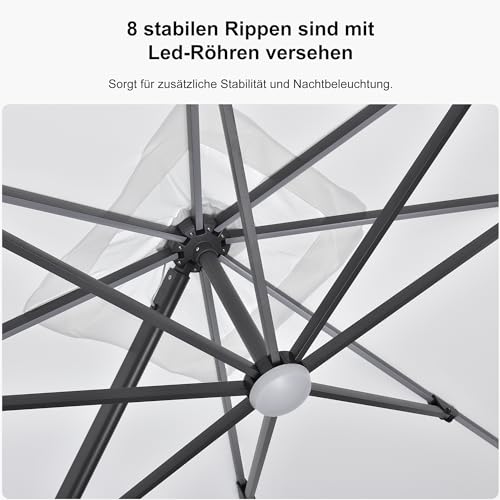PURPLE LEAF Sonnenschirm 300 x 300 cm, Aluminium Ampelschirm mit Solar LED Beleuchtung, Gartenschirm mit Kurbel, 360° Rotation, UV-beständig, Weiß