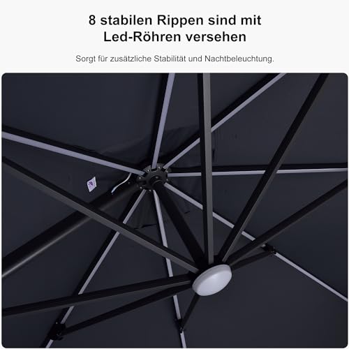 Solar-LED-Leuchten – Der PURPLE LEAF Gartenschirms verfügt über LED-Lichtröhre und ein vorinstalliertes Mittellicht, die nachts für angemessene Beleuchtung. Das Solarmodul am Schirmtop liefert ausreichend Strom, also das Licht ca. 5–6 Stunden