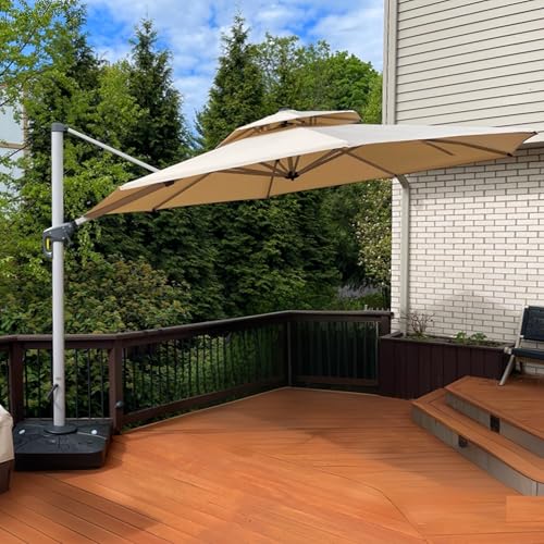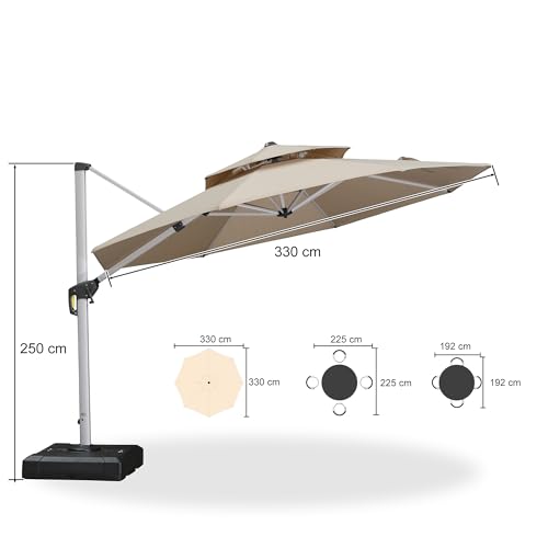 Großer Schattenbereich: Ampelschirm (mit Sonnenschirmständer) 330 cm, das Ihnen eine größere Sonnenschutzfläche bietet,Sonnenschirm mit Doppeldach, verhindert Umkippen bei Wind und gewährleistet Haltbarkeit