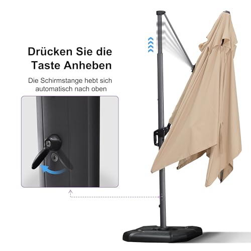 Spezielle Teleskopvorrichtung: Durch die Spezielle Teleskopvorrichtung und abklingen Handkurbel, kann die Schirmstange allesamt- oder eingefahren und die Höhe der Schirmstange verstellt werden