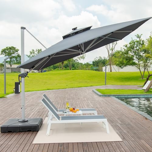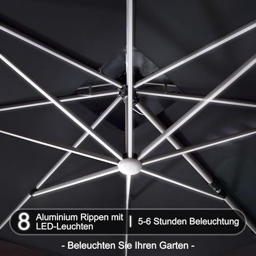 PURPLE LEAF Sonnenschirm 365 x 365 cm, LED Beleuchtung Ampelschirm Quadrat Durchmesser, Groß 360° Rotation, Gartenschirm mit Kurbel, Sonnenschutz UV50+, Grey