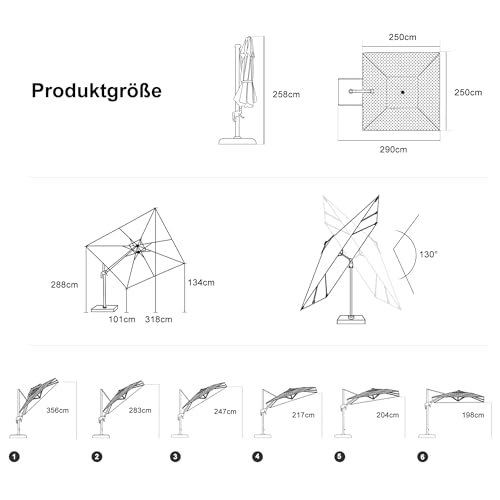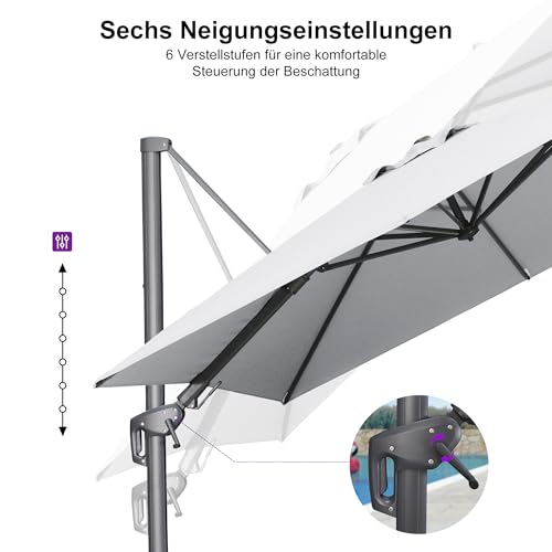 Beidseitige Axialdrehung: Der Schirm ist um 360° drehbar und kann außerdem in 6 Winkeln geneigt und in beide Richtungen geschwenkt werden, um die Sonne abzuschirmen